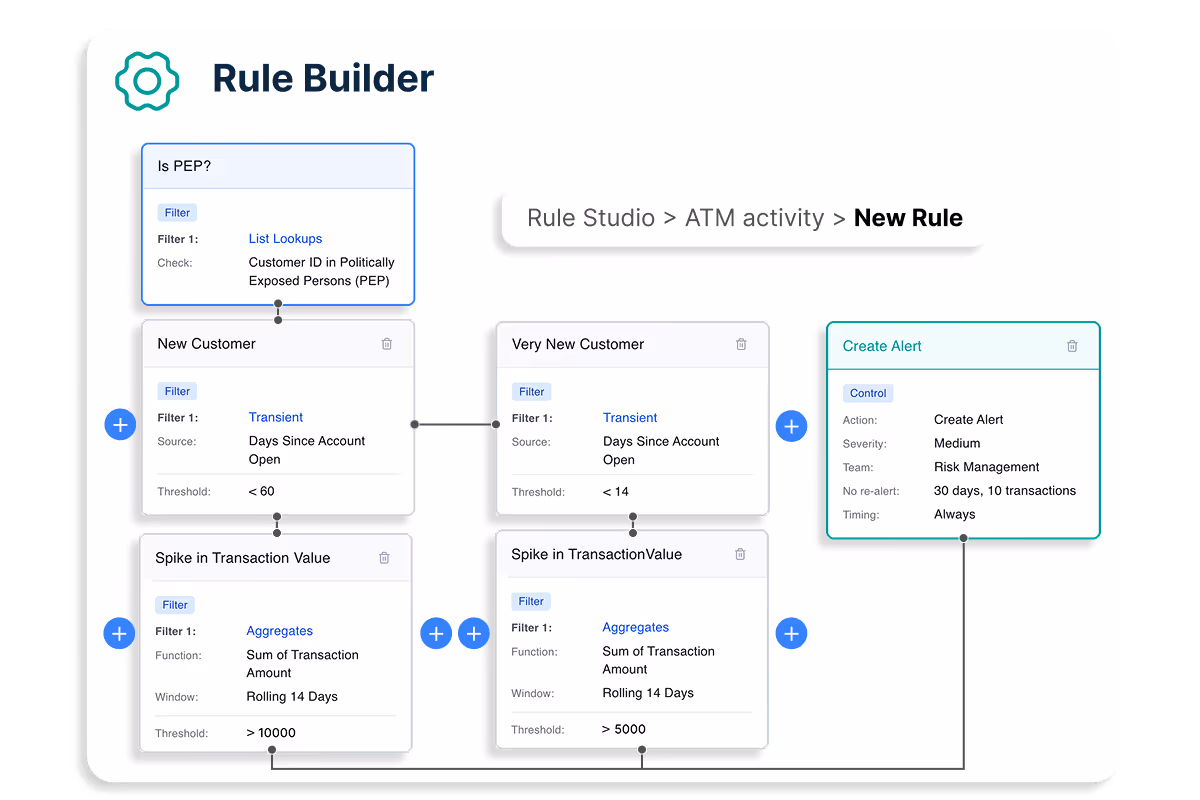 Build and refine AML rules in a visual, no‑code editor with instant feedback on coverage and performance.